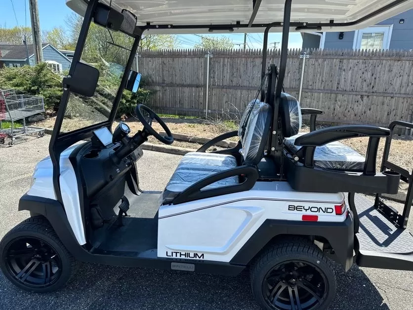 This Bintelli Beyond 4PR street legal golf cart is the newest addition to the Bintelli fleet and it is FULLY loaded! Complete with an aluminum frame, aluminum roof supports, AC motor, LED lighting, 23″ tires, a Bluetooth sound system, reverse camera, hydraulic disc brakes, two-tone premium seats, on-board smart charger, dual USB plugs, extended roof, rear flip seat, head lights, tail lights, turn signals, DOT windshield with wiper, DOT tires, DOT 3-point seat belts, and 105 AH Lithium Battery!